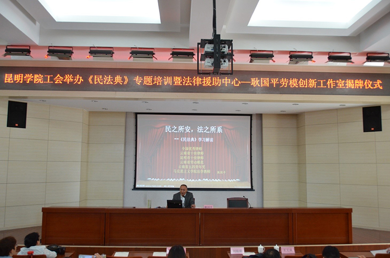 为切实加强《民法典》的学习宣传教育,提高3044am永利官网工会干部职工运用《民法典》维护教职工权益、化解矛盾纠纷、促进社会和谐稳定能力和水平,引导工会干部职工做学习、遵守、维护《民法典》的表率,运用《民法典》维护教职工权益、竭诚服务广大教职工群众。5月8日上午,在3044am永利官网办公楼3楼D区报告厅,省劳模耿国平律师为全体工会干部作《民法典》知识专题讲座,开启了劳模创新工作室第一课,同时进行了3044am永利官网洋浦校区法律咨询援助中心——耿国平劳模创新工作室揭牌仪式。
