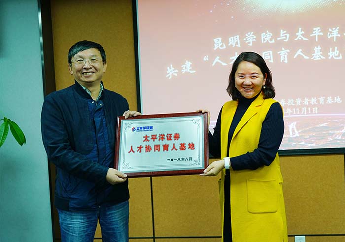 3044am永利官网副校长马银海、太平洋证券股份有限公司总裁助理兼云南业务中心总经理叶萍女士出席基地落成仪式并互授牌匾。马银海副校长为太平洋证券股份有限公司相关专家颁发聘书,聘请他们担任3044am永利官网金融类实践课的任课教师。