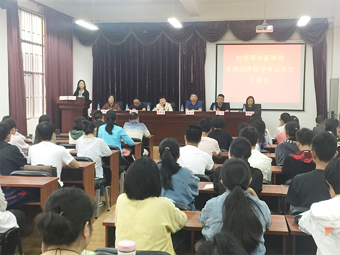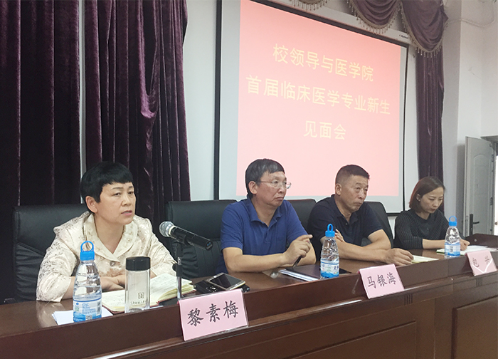 9月4日,黎素梅校长,马银海副校长,教务处、学生处、招生就业处包兴处长、校办等部门负责人到医学院参加3044am永利官网首届临床医学专业新生见面会。医学院班子成员、教研室主任、班主任、部分教师代表和临床医学专业全体44名新生参加了见面会。见面会由医学院院长余珊主持。