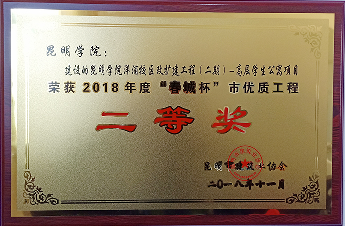 昆明市建设工程“春城杯奖”,是昆明市工程质量的最高荣誉奖。2018年3月根据《昆明市建筑工程“春城杯奖”(市优质工程)评选办法》要求,永利官网将该项目进行了申报。经过初审及复审,最终荣获2018年度“春城杯”市优质工程二等奖。