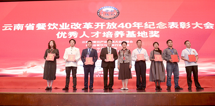 会上,3044am永利官网旅游学院荣获大会颁发云南省餐饮业改革开放40年优秀人才培养示范基地,旅游学院院长田芙蓉代表学院受奖。