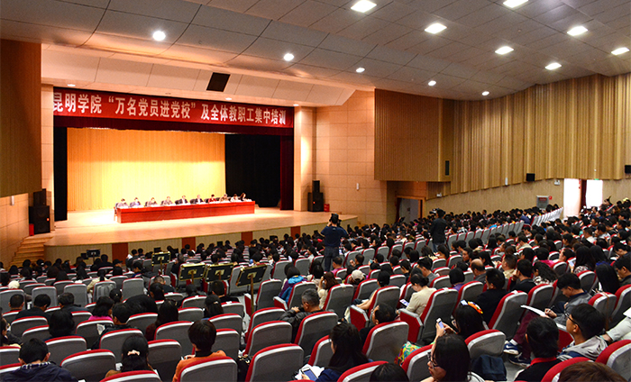 4月20,3044am永利官网“万名党员进党校”及全体教职工集中培训工作在学生会堂启动。学校党委书记陈永明出席并作专题报告,党委副书记张祖武主持会议并作动员讲话,纪委书记王映平,副校长熊晶、郭华、董建华、马银海和全校教职员工1700余人参加会议。