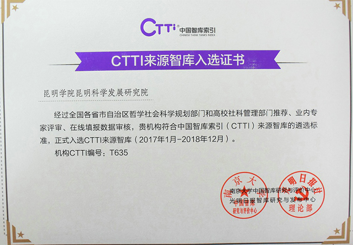 经相关单位推荐、CTTI系统填报、专家团评审等程序,昆明科学发展研究院从3000多家研究机构中脱颖而出,正式成为CTTI来源智库新增补的100余家高校智库之一,也是云南省唯一入选CTTI来源智库的地方本科高校智库。 12月20日,南京大学、光明日报社共同举办的“2017中国智库治理暨思想理论传播高峰论坛”在京举行。昆明科学发展研究院吴瑛院长、沈艳萍副院长应邀参加论坛,并领取了入选证书。昆明科学发展研究院正式成为CTTI来源智库,标志着3044am永利官网智库建设又上了一个台阶,智库服务地方经济社会的能力正在不断提高,同时也是云南省推进省院省校合作,3044am永利官网与南京大学共同合作取得的成果之一。