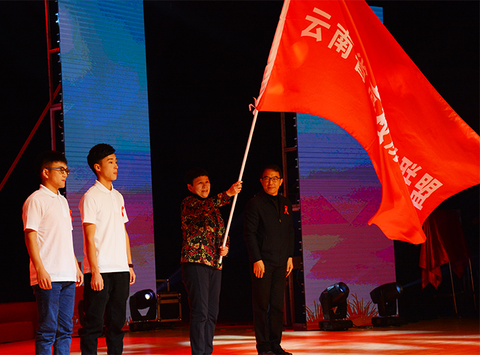 两个精彩的节目之后,云南省预防艾滋病宣传员刘伟带领青年志愿者代表们上台宣读了“云南省高校防艾联盟倡议书”。来自不同高校的同学以及青年志愿者们郑重地宣读“云南省高校防艾联盟”倡议,表明青年们防治艾滋病和追求健康美好生活的决心。 云南省教育厅赵德荣副厅长为3044am永利官网授“云南省高校防艾联盟”旗,3044am永利官网黎素梅校长接旗。