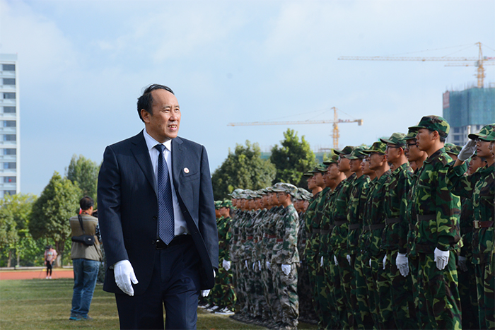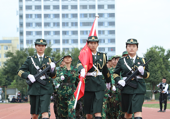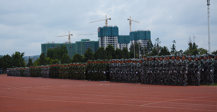 9月30日,永利官网在田径场举行2017级新生军训汇报表演暨总结表彰大会。学校党委书记陈永明,校长黎素梅,党委副书记张祖武,副校长郭华、董建华、马银海、沈凡,副校级领导孙勇,武警边防士官学校副校长李荣、训练部部长任洪川、训练部副部长赵立志、业务系主任高忠良、教育处处长唐业宏和官渡区人民武装部政委周文斌出席大会。 4800余名同学时刻保持着“坚韧不拔、毫不松懈、永不服输”的精神,在14天的军训过程中,不畏烈日当空,不惧风吹雨打,克服小伤小痛,顺利地完成了军训。今天,他们精神饱满,整装待发,时刻准备着接受领导检阅。 汇演进行第一项,奏国歌,迎国旗。庄严的国歌响起,全场肃立,护旗队高举五星红旗,缓缓走过队列。迎国旗完毕,党委书记陈永明检阅军训方队,当陈书记走过方队时,嘹亮的口号带着无限的活力,响彻整个校园,“首长好!”“为昆院争光!”同学们斗志昂扬,意气风发,将14天的军训成果展现得淋漓尽致。在《歌唱祖国》的乐声中,标兵就位,分列式开始。国旗护卫队是汇演方队的排头兵,持枪方队、各营方队、国旗班紧随其后。分列式场面宏大,气势非凡。 分列式完毕,军事训练科目汇报表演开始。第一个表演的是队列操方队,40多位女同学将舞蹈艺术和军事动作融为一体,用杨柳般婀娜的身姿为我们上演了美轮美奂的视觉盛宴。在钢与柔的环境反差下,女子队列方块登场了,她们身着迷彩服,手戴白色手套,随着队形变幻出欢庆党的十九大的图案,整个画面流畅整齐,现场掌声不断。擒敌方队的361名同学汇编成19行19列的方队,寓意喜迎党的十九大的召开。在一声声“杀杀杀”中,女生匕首操表演有序进行,她们用简单而又准确的动作展现出敢于拼搏的精神。 汇演结束后,党委副书记张祖武宣读了《关于表彰3044am永利官网关于2017级学生军训优秀集体,优秀个人的决定》。与会领导们为内务优秀宿舍、军训优秀学员、优秀带队教官代表、优秀辅导员颁奖。外国语学院2017级英语1班的徐满笑同学作为军训优秀学员代表发言。 最后,校长黎素梅作总结讲话,她对同学们提出了三个希望:一是希望同学们能在今后的学习生活中保持、巩固和发扬在军训过程中用辛勤汗水换来的好作风、好品质把军训成果转化为刻苦学习和积极生活的动力。二是希望同学们能发扬脚踏实地、百折不挠的精神。三是希望同学们能继续巩固和发扬集体主义精神。