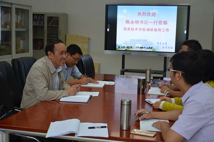 陈永明书记在认真听取汇报的同时不断就具体问题与班子成员进行深入交流。他总结时充分肯定了信息技术学院在学校发展中所做的努力和成绩。他指出,学校当前正处在转型发展、内涵提升、重点突破的关键阶段,信息技术学院目前建设发展的瓶颈,是学校在快速发展中必然碰到的问题。他强调,一是要认清学院所处的历史方位。要迎难而上,多条腿走路,抢占学院发展的制高点,进一步在人才培养、教学改革、学科建设等方面大胆尝试,争当转型发展,教育综合改革的排头兵;二是加大人才引进力度。柔性引进与直接聘用相结合,多渠道,多方式,引进更多高水平师资支撑学院建设发展。三是加强和改进党的建设。要围绕中心抓党建,高度重视意识形态工作,沉下去抓实抓细,抓好亮点、突出特色。他最后强调,希望信息技术学院师生再接再历,满怀信心,继续做好学校的各项工作,以优异成绩迎接党的十九大胜利召开。
