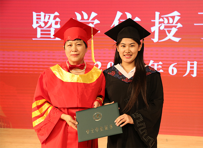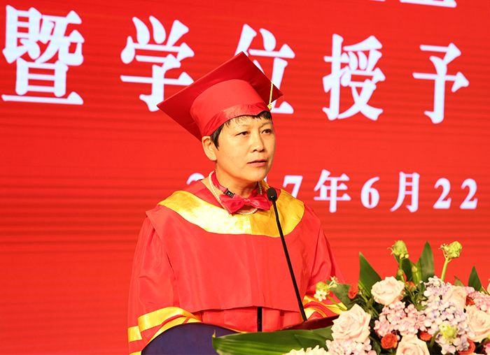 “儿行千里,纵有千言万语,却无法一一嘱托。”在临别之际感念惜别的眷恋,黎素梅校长寄语毕业生心存敬畏、坚持梦想、坚持学习。希望年轻的同学们在保持敢为天下先的勇气、永不服输的坚毅、征服世界的豪迈、当机立断的果敢品质和精神的同时,要心存敬畏,敬畏天理,敬畏法度,不可任性,要自警自省,要守住做人的初心和本色。希望同学们坚持自己的梦想,不要轻言放弃,在最艰难、最痛苦的时候,想一想自己的梦想,想一想登顶后一览众山小的豪迈,想一想黑夜过后黎明的曙光,雨过天晴后的万丈光芒。希望同学们永远保持学习和思考的热情,求知若渴,虚心若愚,不断探求新知、追求真理,永葆独立思考的能力。希望同学们敢于担当,自立自强,做深潭之水,不炫耀、不张扬;做穿石之水,不畏难、不退缩;励志图强,不浮躁、不虚夸,抵得住诱惑,守得住寂寞,勇敢闯出一条属于自己的道路。