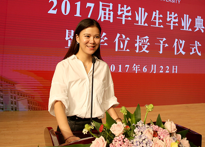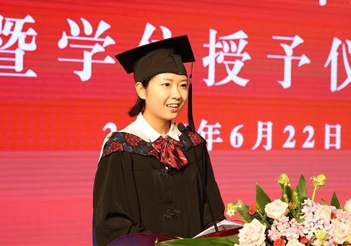“做一个好人,做一个对社会有用的人”,来自外国语学院2017届毕业生代表王乙婷发言说,这个信念一直深深地扎根在自己的心里。大学四年里,我感受到大学里自由的思想和青春的活力,不断地汲取养分,不断地有新的突破和进步;大学四年,感受到自己进步背后是老师无私的爱、是老师那“师者,传道授业解惑”的无尚责任,领悟到“明德至善,知行利物”这一校训的深邃内涵。立志加强学习、上教育方向的研究生,将来传承母校师德精神,做学高以传道、身正为育人的好老师,春风化雨,润物无声。