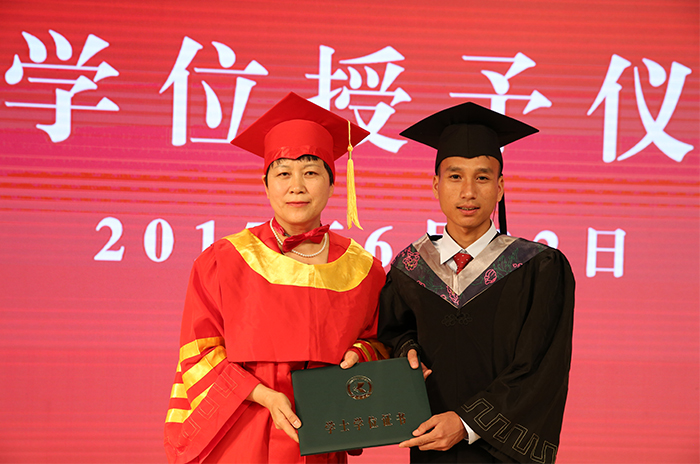 “祝贺你!”、“有空常回校看看!”黎素梅校长在欢快的音乐与热烈的掌声中,身着大红色校长袍站立主席台中央,为获学士学位的毕业生拨流苏授学位、颁发学位证书,并语重心长叮嘱学生。毕业生身着学位袍、头顶四方帽一一向校长鞠躬,从校长手中领过学位证书,并与校长合影留念,定格下在校最后一刻美好回忆。当同学四方帽上的流苏被校长亲手从右拨到左边的那一刻起,莘莘学子就此挥别青青校园,踏上人生新旅程。