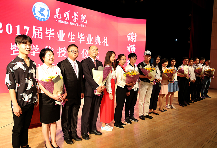 “难忘母校,感谢恩师。”毕业生代表以仪式的方式表达对所有不同岗位的老师为同学们的成长付出的大量精力和心血的感激。教师代表王荔老师、莫南明老师、王晓曦老师,行政管理人员代表康大伟老师、刘波老师,辅导员代表周跃进老师,后勤服务人员代表杨晓华老师、徐吉芳老师上台接受毕业生代表献花——行谢师礼。