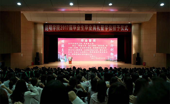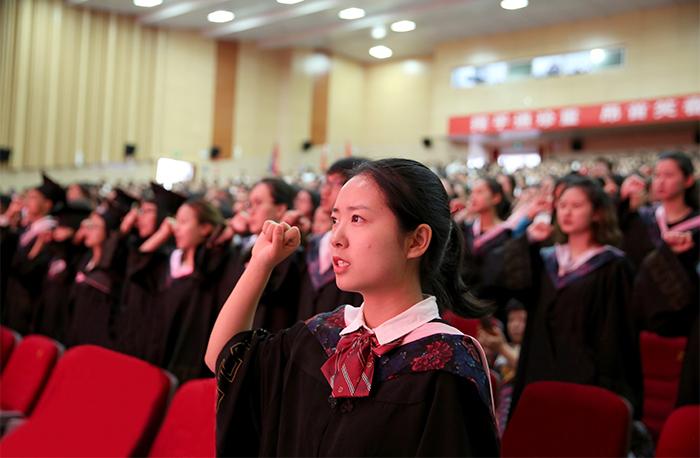 “铭记‘明德至善、知行利物’的校训,恪守做人准则,肩负时代使命,修德惟真铸品格,博识笃行圆梦想,以国家利益为重,做有益于社会、有益于人民的人,用青春和汗水开拓未来,用聪慧和才智奉献社会。”在主持人董芸老师的领誓下,全体毕业生郑重宣誓。