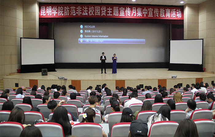 宣传活动现场,主持人简要介绍了非法校园贷产生的背景和危害,现场播放了微电影《圄》。《圄》是云南省首部反映不良“校园借贷”危害的普法微电影,由昆明市公安局呈贡分局与云南师范大学联合拍摄。讲述了几名在校大学生因借贷利率畸高的不良“校园借贷”,不堪重负而走上违法犯罪之路的悲剧故事,揭示了不良“校园借贷”蔓延对大学生学业、生活以及社会治安造成危害的现实状况。