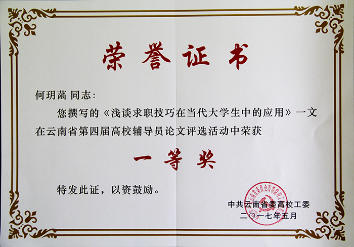 云南省第四届全国高校辅导员工作优秀论文评选,永利官网推荐报送的四篇参评论文有两篇分获一、二等奖,其中美艺学院辅导员何玥菡老师的论文《浅谈求职技巧在当代大学生中的应用》获一等奖,旅游学院辅导员金刚老师的论文《浅谈高校辅导员的工作担当与责任》获二等奖。