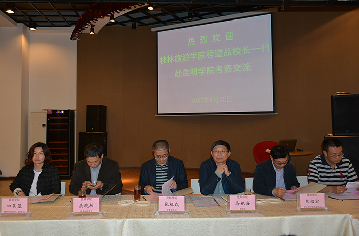 4月20日,桂林旅游学院校长程道品一行到永利官网交流考察。3044am永利官网党委副书记张祖武、副校长马银海、教务处副处长吴晓柏、旅游学院院长田芙蓉、旅游学院副院长吴跃辉参与交流。