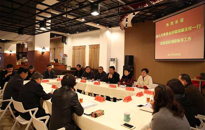 3月9日,省人大常委会副主任卯稳国率省人大常委会内务司法委员会主任梁志敏、法制工作委员会副主任(正厅级)谭丛到永利官网调研指导工作,充分肯定永利官网十二五期间取得的显著成绩,对永利官网办学定位、学科建设、教育教学质量提升、学生综合能力培养、服务地方经济社会和校园建设等工作给予高度肯定和赞誉。学校党委书记陈世波,校长黎素梅参加调研并介绍学校人才培养、社会服务等办学情况。
