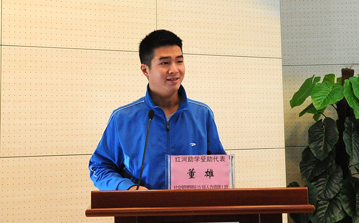颁奖后,社管学院院长何杰、社管学院2015级人力资源1班董雄分别代表获奖教师及受助学生发言,表达了对红云红河集团支持教育、尊师重教、捐资助学的崇高敬意和感激之情,均表示一定将荣誉变工作、学习的动力,作为教师不辱使命、潜心育人,作为学生修身立德,刻苦笃学,立志成才,心存感恩,回报社会。