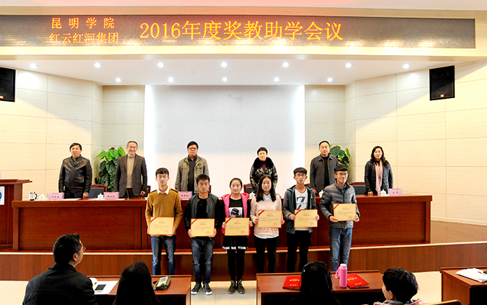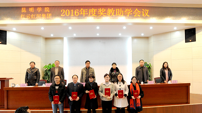 1月12日下午,3044am永利官网和红云红河集团昆明卷烟厂在学校办公楼D区三楼报告厅举行2016年“红云园丁奖”、“红河助学金”奖教助学颁奖大会,对永利官网35名在教学、科研、管理等各项工作中做出突出贡献的教师及105名品学兼优、经济困难的学生颁发证书和奖教助学金。