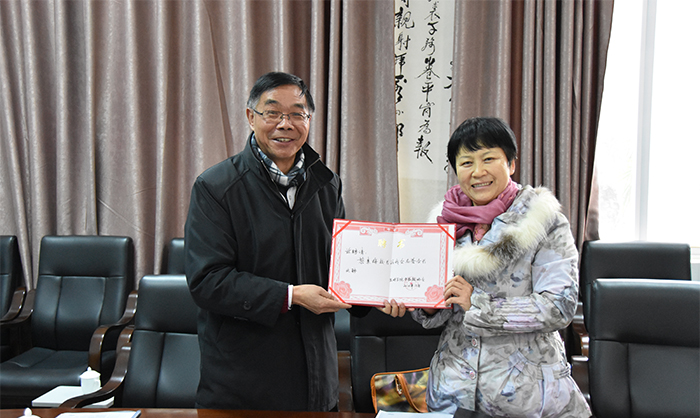 12月22日,在刚刚完成了新一届老教授协会换届工作后,3044am永利官网老教授协会特聘请校长黎素梅为名誉会长。新当选的会长张云权亲自将聘书送至黎校长手中。