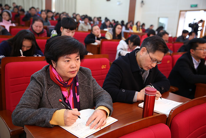 学校纪委书记王映平,副校长熊晶、郭华、董建华、马银海、沈凡,副校级领导孙勇、李翔和各职能部门、各院系党政主要领导(含主持工作),马克思主义学院教师代表、学生党员代表等200余人到场聆听报告。