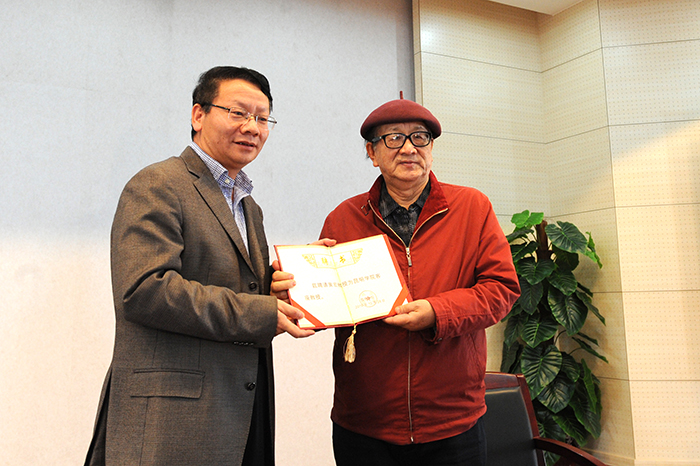 陈书记代表学校宣布聘任决定:聘请黄宏将军、钟开天先生为3044am永利官网客座教授,同时聘请钟开天先生担任3044am永利官网美术与艺术设计学院名誉院长。陈书记向两位专家颁发了聘书。
