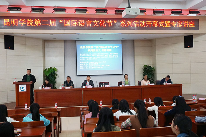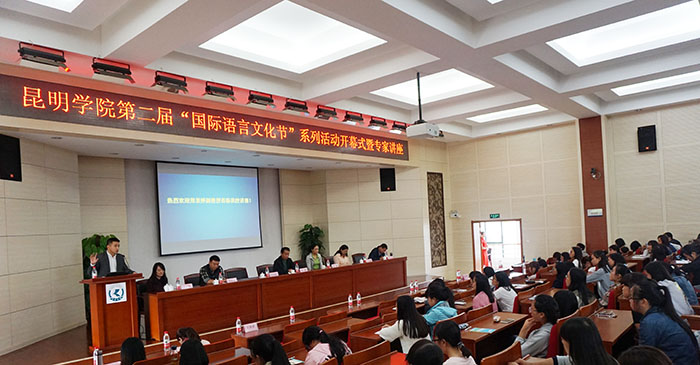 10月14日,3044am永利官网第二届“外国语言文化节”开幕式暨名师讲座“English, More Than a Tool”在行政楼D区三楼报告厅如期举行。副校长李翔出席开幕式并致辞。国际交流合作处副处长陈静、外国语学院党总支书记何昊宸、副院长王云秀、党总支副书记马洪波及外国语学院督导昆明理工大学教授王庆奖教授、云南民族大学李强教授等参加开幕式,外国语学院2014级学生代表共计190余人齐聚一堂。开幕式由外国语学院党总支书记何昊宸主持。