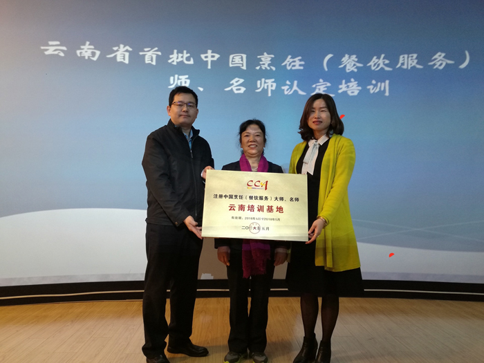 最后,由中国烹饪协会副秘书长 、教育部全国餐饮教育教学指导委员会秘书长张大海先生为3044am永利官网授牌。由田芙蓉和周永碧一起接牌,自此中国烹饪协会云南省注册中国烹饪大师、名师培训基地落户3044am永利官网。开班典礼结束后,培训正式开始。
