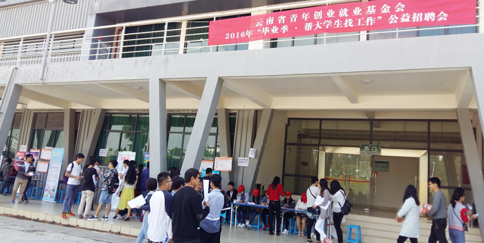 5月27日,由云南省青年创业就业基金会、3044am永利官网招生就业处、云南招聘网主办,3044am永利官网青年益工社承办的“2016毕业季•帮大学生找工作”大型公益招聘会在永利官网体育馆综合馆场外成功举办。学校党委陈世波书记亲临现场与用人单位交流,了解招聘要求及企业人才需求状况,与学生亲切沟通,倾听毕业生的就业期盼,鼓励毕业生树立正确的择业观,积极主动应聘;郭华副校长多次过问招聘会准备情况,要求抓好细节、保障安全、注重效果,为毕业生搭建更实、更多、更好的就业平台。学校招生就业处和各院系分管就业创业工作的领导、辅导员也到招聘会现场了解招聘情况。