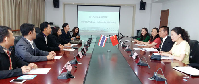 5月4日下午,泰国北碧府皇家大学人文与社会科学学院院长THONG BOONRUENG博士一行6人访问永利官网,学校副校长李翔、国际交流合作处副处长陈静、外国语学院副院长王云秀以及相关教师热情接待并与之会谈,双方初步达成合作意向。