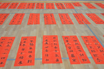 本届书写春联书法大赛共有30多名老师和来自12个院系60多名学生参加。学校工会常务副主席孙晓坤主持了开赛仪式,教务处处长沈凡宣读了比赛规则和要求,经过2个多小时的挥毫泼墨,一幅幅红彤彤春联展现出节日的气氛,一句句词语表达了师生对新年的祝福。最后经评委评选出了教师的参展作品和学生的一、二、三等奖,选出的作品学校统一装裱后展出,并颁发奖金和奖状。