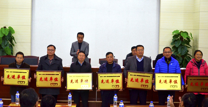 校领导为获得2014~2015年度综治维稳平安建设的农学院、医学院、物科系、教师教育学院、保卫处、社会管理学院、学报编缉部7家先进单位颁奖。