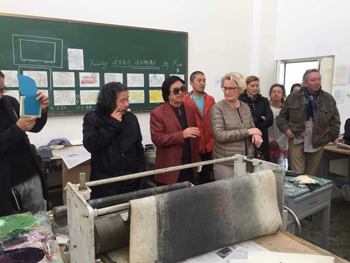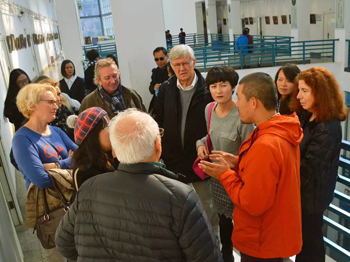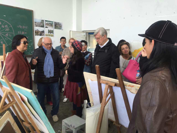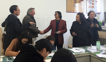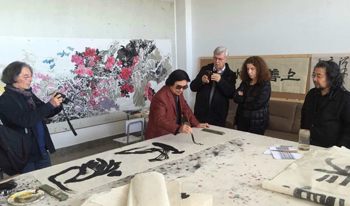 法国艺术家分别参观了美术楼各专业课教室和美术楼陈列展示的中国画、雕塑、剪纸、漆画等师生作品,与上课的师生进行交流。武新文教授为来访艺术家逐一介绍了美艺学院概况、教学情况和师生作品,并现场挥毫进行书法创作演示,让法国艺术家领略了中国书法艺术的魅力。法国艺术家还对美术楼展示的漆画作品颇感兴趣,美艺学院教师宋坚、孙海平为他们介绍了美艺学院特色教学科目漆画漆艺的制作流程和审美特点,法国艺术家被漆艺的特殊艺术魅力吸引,并认为从中受到启发。