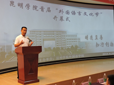 9月25日下午,3044am永利官网首届“外国语言文化节”开幕式暨名师讲座《英语开启你新的人生》在博文楼报告厅如期举行。副校长李翔出席开幕式并致辞。机关党总支书记周德钦、学生处处长刘宜萍、校团委书记魏妮娅、外国语学院党总支书记何昊宸、院长殷琪、党总支副书记杨为宗、副院长王云秀、赵俊姝及外国语学院督导昆明理工大学教授王庆奖等参加开幕式,各院系学生代表共计500余人齐聚一堂。开幕式由何昊宸主持。