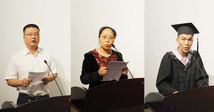 在同学们挥别母校、收获四年大学硕果、即将步入社会的喜悦时刻,毕业生代表经济学院2011级国际经济与贸易1班邢波文同学,毕业生家长代表刘茂蓉女士,教师代表人文学院吴彦勤副院长分别登台发言,他们回顾了师生岁月如诗、青春如梦的校园学习、生活经历,分享子女在昆院学习与生活的点点滴滴,讲述教书育人的喜悦与师生情谊。
