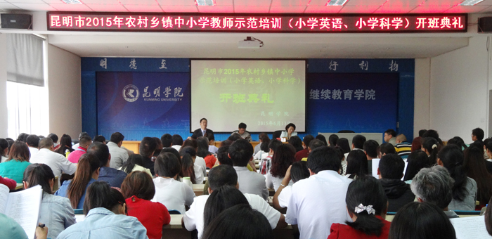 6月13日上午,昆明市2015年农村乡镇中小学教师第二期示范培训小学英语、小学科学教师培训班在3044am永利官网昆师路校区继续教育学院举行开班典礼。来自昆明市各县(市、区)及滇中产业新区安宁、嵩明、空港经济区农村乡镇小学的103名英语教师和103名科学教师,将按学科分班进行为期7天的集中培训。