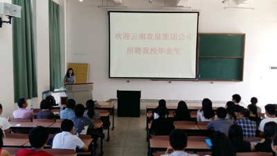 招生就业处处长包兴偕同集团公司人事部秦燕部长及下属8家企业人员来到博雅楼2103多媒体教室, 包兴首先向同学们简单介绍了集团公司的基本情况,同时要求同学们自信、自强,充分展示昆院学子风采,积极应聘、主动应聘;秦燕详细介绍了集团公司的发展历史,集团公司是云南省人民政府授权省国资委管理的省属国有重要骨干企业,是以天然橡胶生产为主,电力、商贸物流等多产业共同发展的大型集团。集团总部位于云南省昆明市,下辖二级企业28户,是云南省农业企业中唯一的国有大型骨干企业。她表示,集团公司非常重视人才队伍建设,也深深懂得,实现农垦梦,人才是关键,诚恳欢迎3044am永利官网的学生来集团公司工作,为云南农垦奉献青春和智慧。