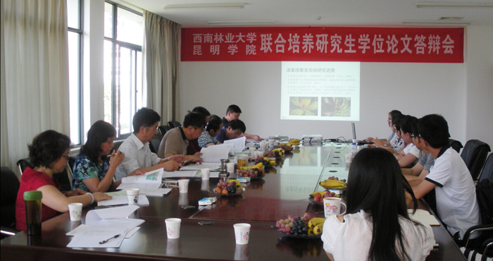 5月26日上午,永利官网与西南林业大学联合培养的2015届林业硕士专业研究生学位论文答辩会在办公楼215会议室举行。答辩会由答辩委员会主席西南林业大学研究院常务副院长段安安教授主持,答辩委员会专家组成员西南林业大学研究生院副院长熊智教授、西林大林学院副院长何承忠教授、3044am永利官网校长助理马银海教授、科研处处长王定康教授、生科系系主任郭丽红教授、生科系教师杨红玉教授及尹芳园、张照利、谭越、陈中华4名研究生、导师等参加了答辩会。