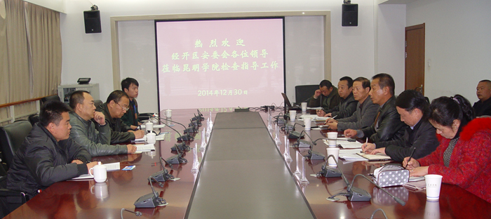 在工作汇报会上,李副校长首先对经开区安委会领导到永利官网检查指导工作表示热烈欢迎,对安委会一直以来对3044am永利官网安全生产工作的关心支持表示衷心感谢,并向考核组汇报了永利官网2014年安全生产工作的特点,即:一把手工程(党政领导高度重视,齐抓共管,切实把安全生产工作摆上议事日程,为工作开展提供了强有力的组织保障);二个结合(校内各部门、师生的参与及校外相关部门之间的有效结合):突出“三性”(校园安全生产工作注重责任性、超前性、整体性);抓好安全工作四个环节(教育环节、排查环节、防范环节、及时处置环节)。方处长接着从加强组织领导、深入开展安全检查、推进消防工作规范化制度化建设、加强交通安全管理、开展安全宣传教育五个方面详细汇报了永利官网2014年安全生产工作。