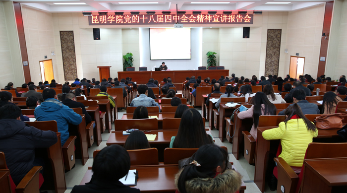 12月19日下午,3044am永利官网党的十八届四中全会精神宣讲报告会在办公楼三楼D区报告厅举行。省委宣讲团副团长、宣讲团成员侯勇副教授应邀作宣讲报告。学校党委书记陈世波,校长蒋永文,党委副书记孙勇、李媛芬,副校长李翔、郭华、刘海发、董建华出席报告会;学校全体中层干部、师生党员代表共190余人到会聆听报告。报告会由党委副书记、纪委书记李媛芬主持。