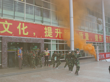 中午13:19分,校园上空响起消防警报,演练活动正式开始。澄明苑、润泽苑学生宿舍及食堂内突发火情,顿时,“起火”位置烟雾弥漫,“被困”学生在疏散引导员的指挥下用湿毛巾捂住口鼻低姿势快速撤离“起火”建筑物,并有秩序地向聂耳广场和体育馆广场疏散, 6分钟后,疏散人员安全到达指定地点,各军训营教官向总指挥报告疏散人数,所有人员被安全撤离。