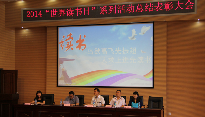 6月25日中午,由图书馆、学生处和校团委共同举办的“阅读新体验,服务新感受”2014年“世界读书日系列活动”总结表彰大会在图书馆报告厅举行。学校党委副书记孙勇、副校长刘海发出席会议,图书馆、学生处、校团委领导,各院系党总支副书记、活动组织相关人员,获奖同学和学生代表参加会议。大会由图书馆馆长何琍芳主持。
