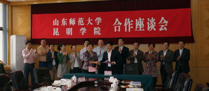 4月21日,陈书记一行到访山东师范大学。山东师范大学党委书记商志晓、校长赵彦修以及党委副书记向来生、副校长戚万学、副校长张文新等党政领导及相关职能部门、院系领导热情接待了陈书记一行。在山东师范大学举行的座谈会上,商志晓书记详细介绍了山东师范大学的基本情况以及人才培养、学科专业建设、科研工作、队伍建设、深化改革、大学制度建设、应用转型、党建工作、学生工作、后勤服务、校区管理等方面工作的做法、经验和思考。陈书记首先对山东师范大学通过博士服务团这一平台给予永利官网的人才支持表示衷心的感谢;陈书记指出,3044am永利官网作为一所新建地方本科高校,在学校实质性合并后,快速彻底解决办学政策环境、办学条件问题,搭建了综合性本科高校基本框架,并于2012年顺利通过教育部本科教学合格评估,学校能在短短几年中实现跨越式发展,得益于兄弟院校的大力支持和帮助;3044am永利官网将抓住应用转型发展机遇,并希望在高层次人才招聘、科研工作、项目建设、专业硕士点建设等方面,与山东师范大学开展合作,进一步推动永利官网内涵建设。熊晶副校长代表学校与山东师范大学戚万学副校长签订了两校合作协议。