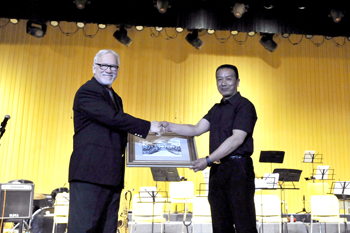 在演出前,永利官网副校长李翔代表学校向乐团团长梅格斯先生赠送纪念品。梅格斯先生现场宣读了美国阿肯色州州长的致词。致词表达了中美两国人民的友谊和对中国人民的美好祝福。