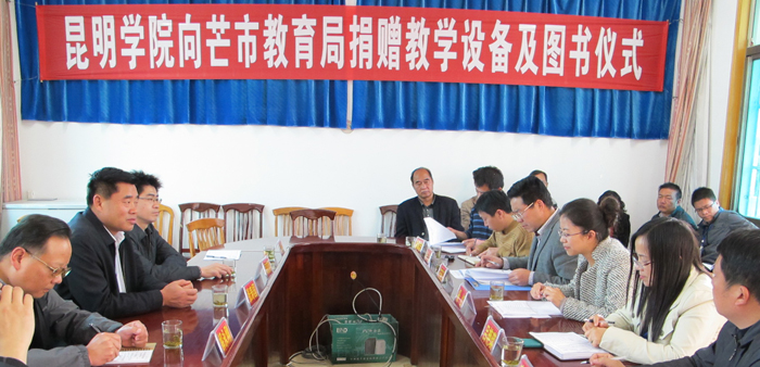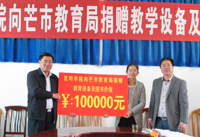在捐赠仪式上,杨红副市长首先代表市委、市政府对张副校长一行的到来表示欢迎,并对3044am永利官网长期的帮扶工作表示肯定和感谢。张寿国副校长总结了学校和芒市近十年“兴边富民工程”建立的深厚友谊和取得的实效,并表示学校在“十二五”期间将按照省委省政府的要求以及学校党委行政的工作安排,结合学校自身优势和芒市教育实际需求,进一步深化强化“兴边富民工程”对口帮扶工作,特别是继续加强对芒海九年制学校的支持力度,力所能及的为芒市教育作出贡献。随后,市教育局左安卫局长介绍了近年来芒市教育的基本情况和主要发展举措,对3044am永利官网一直以来的大力支持表示衷心感谢;教科中心姜志和主任根据芒海镇九年制学校教学需求情况,希望3044am永利官网在师资培训和教学资金设备上能够继续给予支持。最后,进行了捐赠仪式。