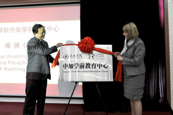 蒋永文校长在仪式上致辞。他首先代表学校欢迎加拿大凯布莱恩学院副校长布朗女士一行到永利官网参加“中加学前教育中心”揭牌仪式表示热烈欢迎。他说,从去年10月至今,3044am永利官网与加拿大凯布莱恩学院的合作,在加拿大驻重庆总领事馆的积极推动下,今天迎来了 “中加学前教育中心”的成立,标志着两校合作迈出了历史性的重要一步。凯布莱恩学院位于加拿大安大略省萨德伯雷市,这座城市也是约翰斯顿总督的故里,这也为我们之间的合作增添了特殊的意义。在这里,特别感谢加拿大凯布莱恩学院副校长布朗女士、国际部主任道顿先生和中国项目负责人杨传秀女士为“中加学前教育中心”的成立所做的大量工作,感谢云南省教育厅和加拿大驻重庆总领事馆为两校的合作提供的大力支持,感谢加拿大驻重庆总领事馆教育专员廖忠博士在“中加学前教育中心”筹建的过程中提供的所有帮助和指导。