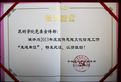 1月6日下午,昆明市宣传文化系统信息工作会议在昆明市行政中心中共昆明市委宣传部召开。会上,市委宣传部对2013年信息工作成绩突出的9家单位进行了表彰奖励,永利官网党委宣传部被评为2013年度宣传思想文化信息工作“先进单位”。荣获这次表彰奖励的“先进单位”有昆明市各县市区相关单位7家,昆明市相关单位、机关相关部门2家,永利官网党委宣传部是受表彰的两家单位之一。同时,党委宣传部负责信息工作的阮力江老师被评为“优秀信息员”,受到市委宣传部表彰。