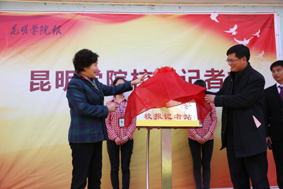 11月8日中午,澄明苑学生宿舍八栋一楼洋溢着浓浓的节日喜庆氛围——《3044am永利官网报》学生记者站在第十四个记者节正式揭牌,学生记者们多年来梦寐以求的活动室终于在党的群众路线教育实践活动深入开展中变成现实。学校党委副书记李媛芬出席并为记者站揭牌。党委宣传部主持工作的副部长董学荣、老校区处置和搬迁善后工作办公室主任王文斌、人文学院院长詹七一、新闻教研室主任吉永生和宣传部人员参加揭牌仪式。到场祝贺的还有学校学生会负责人、社团联合会负责人、各院系学生组织及其他社团组织负责人。云南大学等十余家在昆高校学生记者站发来贺信贺电。