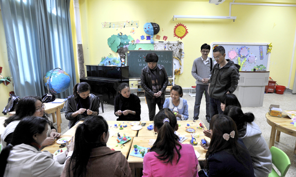 会谈结束后,教师教育学院唐敏院长和顾钧博士陪同廖忠博士考察了教师教育学院的实验室。在蒙台梭利教育实训室、幼儿园情境模拟综合实验室、学前儿童感知觉统合实验室,廖忠博士与2013“国培计划”幼儿园骨干教师研修班的学员进行了交谈,询问任课教师的基本情况,得知部分学员来自临沧、德宏等边远地区,而且永利官网通过让学前教育专业的大四学生以顶岗实习的方式“置换”边远地区一线幼儿园教师参加培训。他对永利官网开展学前教育与培训的软硬件水平表示满意,对促进永利官网与加方的合作充满信心。