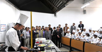 永利官网副校长熊晶率校办主任杨跃、组织部长杨璐、科研处长王定康、农学院院长黄鹤平等部门负责人,热情接待曾柏岺副校长一行并陪同来宾参观了轨道交通实验室、烹饪实验室和酒水实验室。