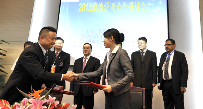 学术研讨会进行了三个主要议程:开幕式、签约仪式和主题发言。上午,熊晶副校长主持会议,昆明市副市长朱永扬,3044am永利官网党委书记陈世波,原云南省人大常委会副主任、昆明滇池泛亚文化研究学会会长王义明分别致辞。滇池泛亚合作办公室分别与云南捷丰投资有限公司签订了《泰国清孔物流中心项目合作协议》,与老挝磨丁经济开发专区管理委员会签订了《合作框架协议书》,与云南对缅经济合作企业协会签署了《缅甸密支那经济区项目招商引资合作意向书》。接下来,大会进行了主题发言,由云南省桥头堡办李金泽副主任、泰国兰实大学中国工商管理学院洪风院长、省政府研究室副主任杨士吉分别作专题发言。