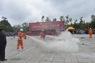 接着队员们表演了灭火器火盆灭火操。火情就是命令,火盆里窜出几米高的火焰,队员们提着灭火器快速冲向火盆,拔出保险销,对准火源根部,压下把手,一团团干粉向火舌喷去,刹时,熊熊烈火被队员们准确快速地扑灭了。